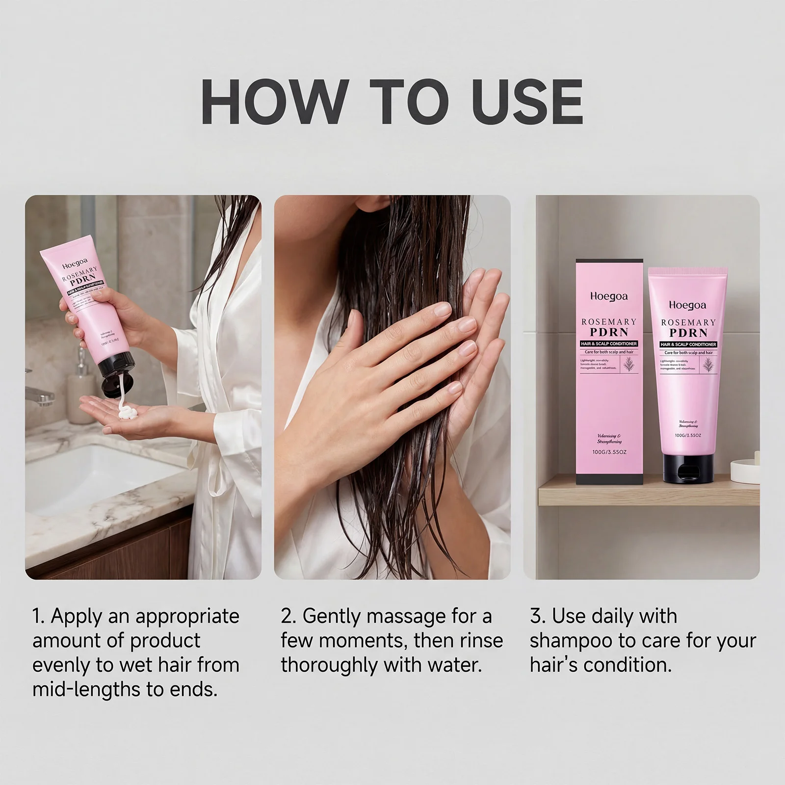 1.Aplique uma quantidade adequada de produto uniformemente no cabelo molhado, do meio até as pontas.2.Massageie suavemente por alguns instantes e depois enxágue abundantemente com água.3.Use diariamente com shampoo para cuidar da condição do seu cabelo. Aviso: